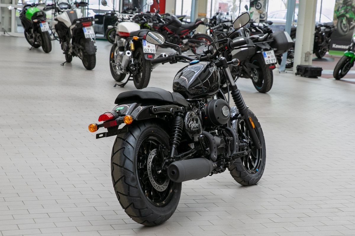 Ganz in schwarz rollt das Bobber-Bike als echtes optisches Highlight über den Asphalt.